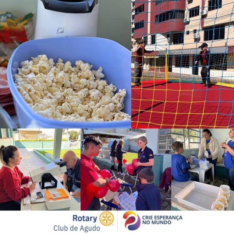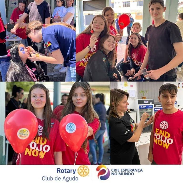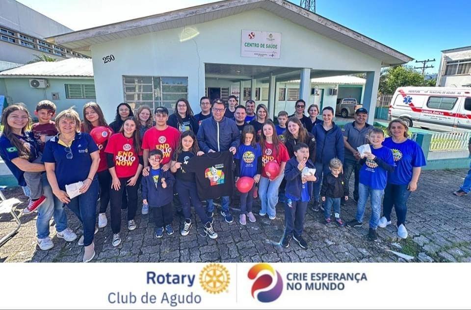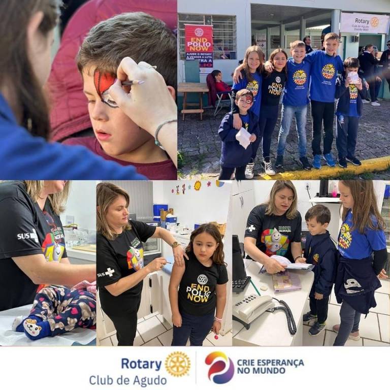 Neste sábado (14/10/2023), o Rotary Kids e Interact, com o apoio do Rotary Club de Agudo, em parceria com a Secretaria Municipal de Saúde de Agudo, realizaram a Campanha da Pólio, ação global do Rotary Internacional, conjuntamente com a Campanha Nacional de Multivacinação, acolhendo nossas crianças com o oferecimento de cama elástica, pintura de rosto, pipocas, sucos, guloseimas e balões. É o Rotary acreditando no poder da vacina e no combate à paralisia infantil.