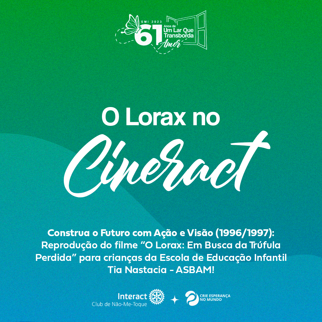 Para este segundo dia, com o lema do Ano Rotário 96/97 “Construa o Futuro com Ação e Visão”, realizamos um Cineract, reproduzindo o filme O Lorax: Em Busca da Trúfula Perdida para o turno da manhã da Escola de Educação Infantil Tia Nastacia - ASBAM, visando conscientizar a nova geração sobre preservação do meio ambiente e sua importância para a vida no planeta Terra através de uma animação lúdica.