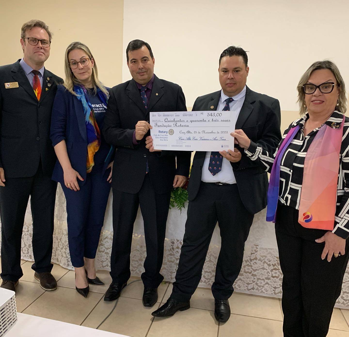 Os Clubes de Rotary de Cruz Alta deram de presente ao Gov. Alex e sua cônjuge Lisiele um cheque simbólico com doação para Fundação Rotária.