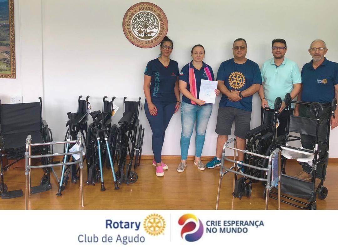 Nesta segunda-feira (27/11/2023), junto à Prefeitura Municipal de Agudo, o Rotary Club de Agudo recebeu da Secretaria da Saúde, por meio de cedência para uso, 02 andadores, 02 cadeiras de banho, 04 muletas e 05 cadeiras de rodas, de modo a incrementar o Banco Ortopédico do Rotary Club, visando o bem-estar dos cidadãos agudenses que necessitarem de equipamentos especiais para locomoção.