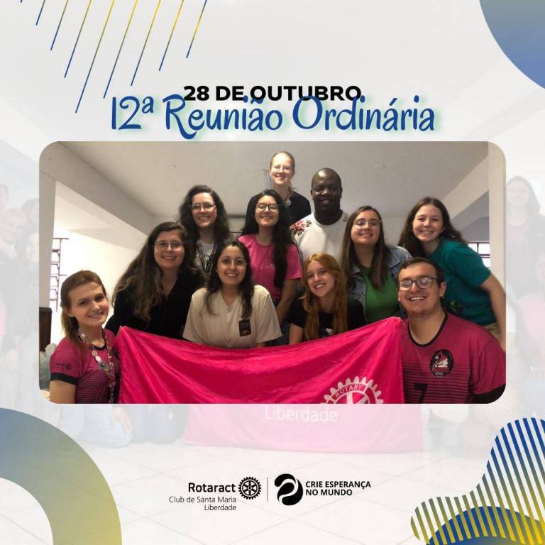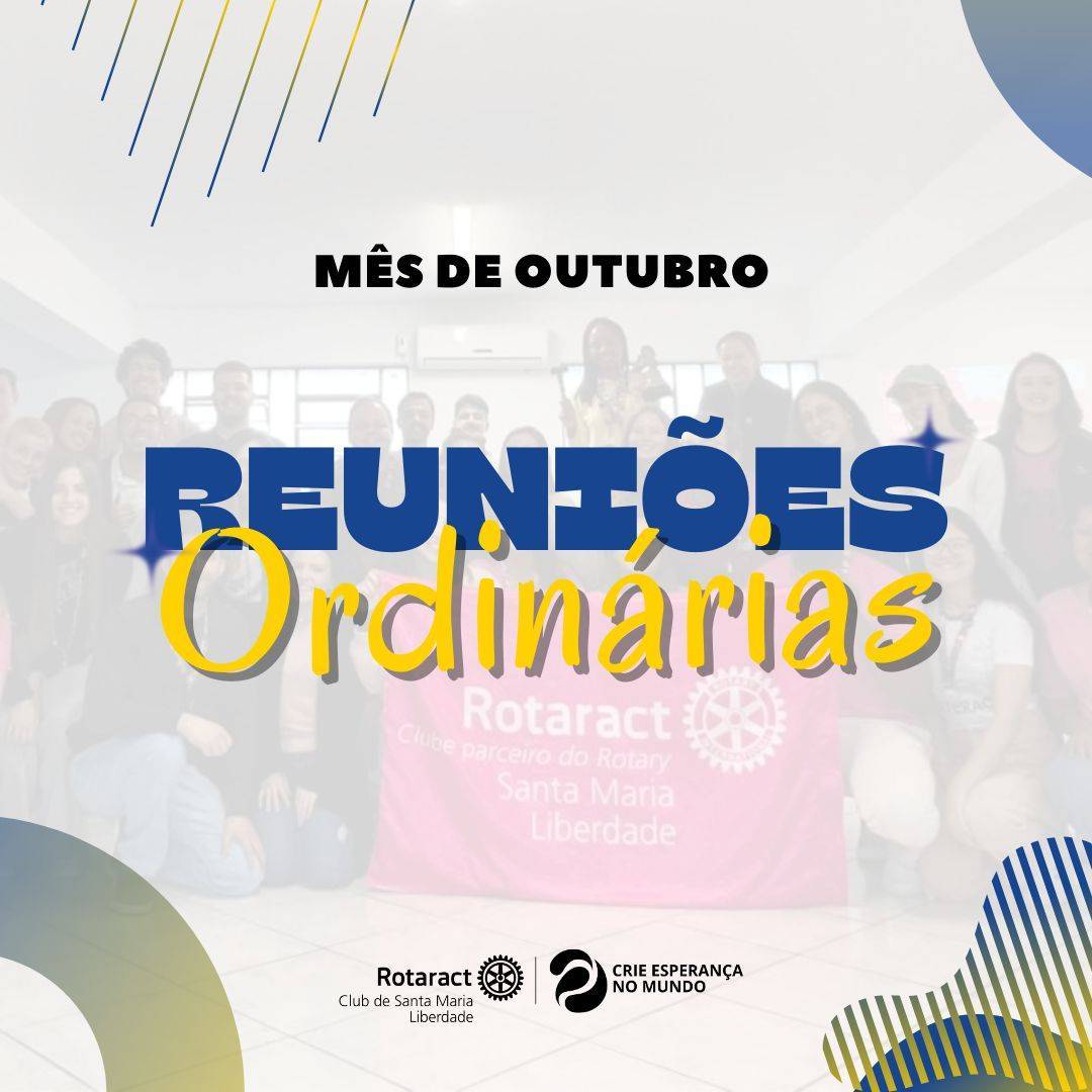 Nos dias 21 e 28 de outubro o Rotaract Club de Santa Maria Liberdade realizou as suas primeiras reuniões ordinárias da gestão 2023-2024, sob o lema “Crie esperança no mundo”. As reuniões consistem em encontros semanais presenciais aos sábados às 15 horas e têm por finalidade proporcionar um espaço de organização, integração e discussão a respeito das ações propostas pelo clube ao longo da gestão.