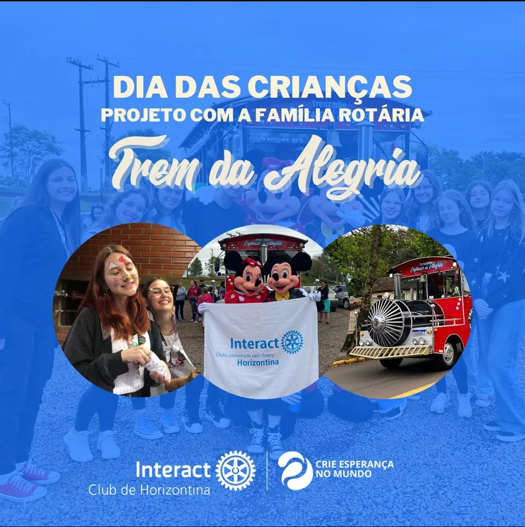 No dia 12 de outubro, em comemoração ao dia da criança, fizemos parte de um projeto no qual toda família rotária participou. Ficamos responsáveis pelo Trem da Alegria, nos fantasiamos dos personagens Mickey e Minnie e animamos o trem!