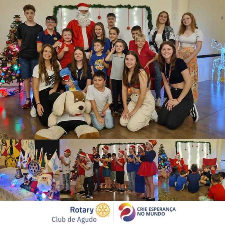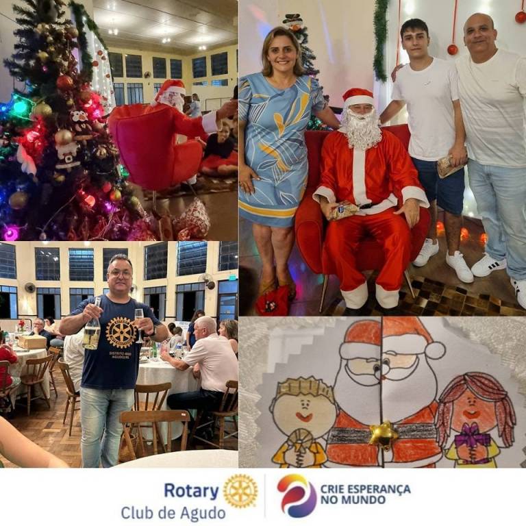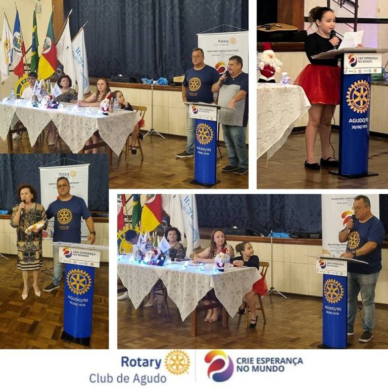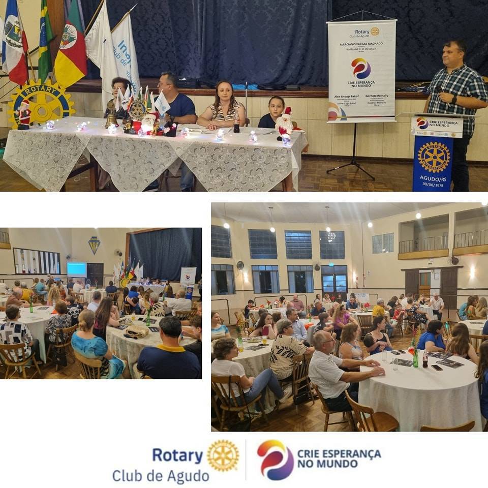 O Rotary Club de Agudo realizou a Festiva Natalina e Encerramento do Ano de 2023, com a divulgação dos trabalhos e projetos realizados pela Gestão 2023/2024 no 2º semestre de 2023, discursos pelos presidentes/representantes do Interact (Douglas Jaime de Oliveira), Rotary Kids (Valentina de Souza Machado) e Casa da Amizade (Srª Odima Dittel) canções pela Companheira Lisane Drews, mensagem natalina pela Companheira/Cônjuge Roselaine Rosane Machado de Souza e discurso final pelo Presidente Marciano Vargas Machado e pelo Vice-presidente Gilson Evandro da Rosa. Na mesma ocasião, houve a entrega da nova bandeira da Casa da Amizade e a distribuição de presentes pelo Papai Noel. Após, foi servido um delicioso banquete aos presentes. Uma noite encantadora da Família Rotária para estreitar os laços de amizade e companheirismo!!! Boas festas!!!