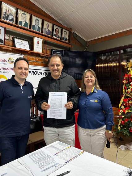 O Presidente Andrei De Carli, Geni Zandoná Gehlen presidente da Fundação Rotária- ABTRF do RC de Palmeira das Missões e o Companheiro Eduardo Antônio Danieli, membro da equipe distrital da ABTRF passaram as informações. As empresas que assinaram o termo de compromisso foram: