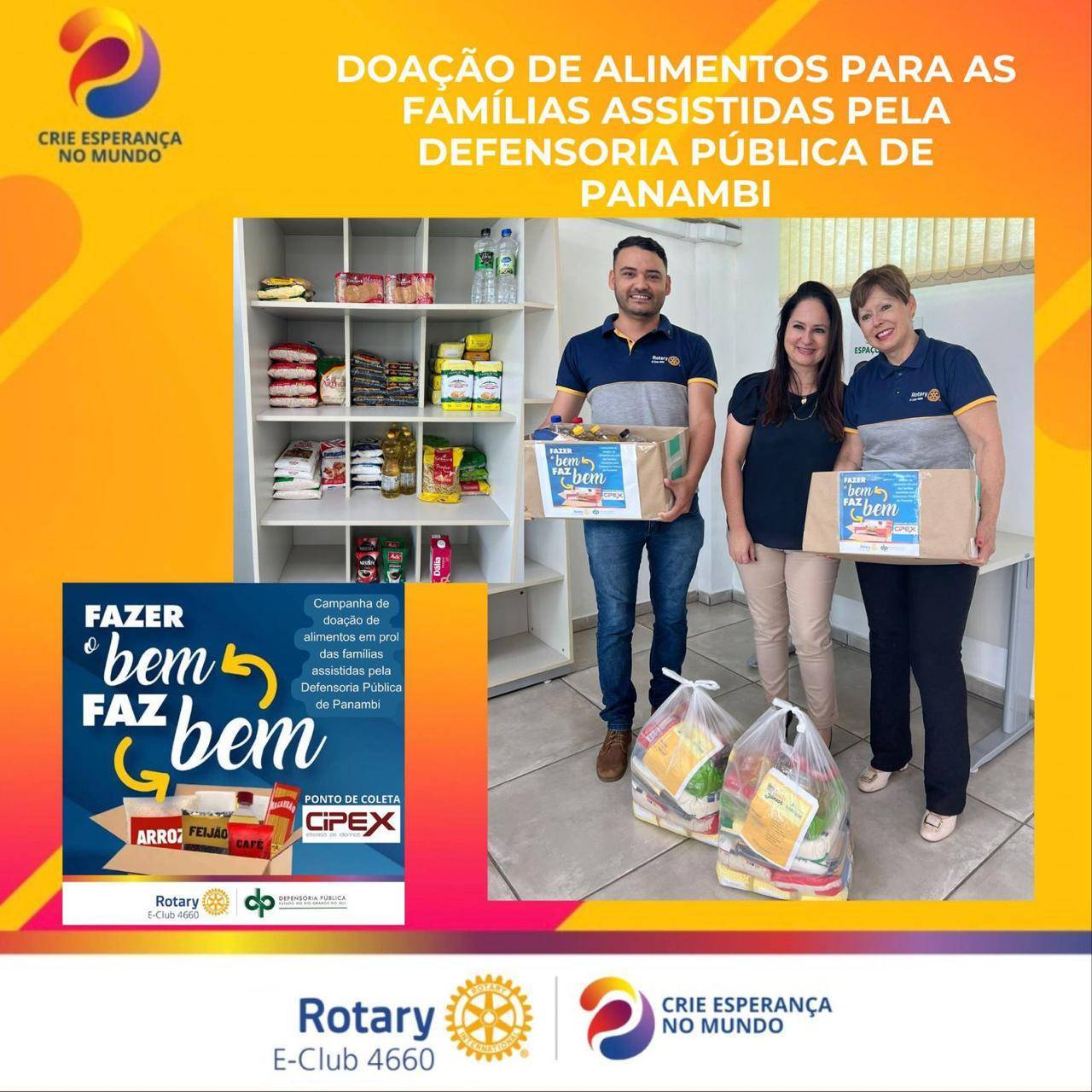 Na manhã de 13 de março os rotarianos Leonardo Guilherme e Ester Trentini realizaram a entrega de alimentos para a campanha da Defensoria Pública de Panambi em prol das famílias assistidas pela unidade Panambi. Os alimentos foram arrecadados em parceria com o Cipex Panambi e os associados do clube. O Rotary E-Club do Distrito 4660 é um clube virtual de Rotary e tem associados em Panambi e mais 10 cidades. O clube apoia projetos voluntários e sociais que melhoram a vida das pessoas em 7 áreas de enfoque. O clube se reúne virtualmente via zoom nas quartas e sábados às 20 horas. Quem desejar conhecer mais ou se associar pode entrar em contato através do Instagram @rotaryeclub4660.