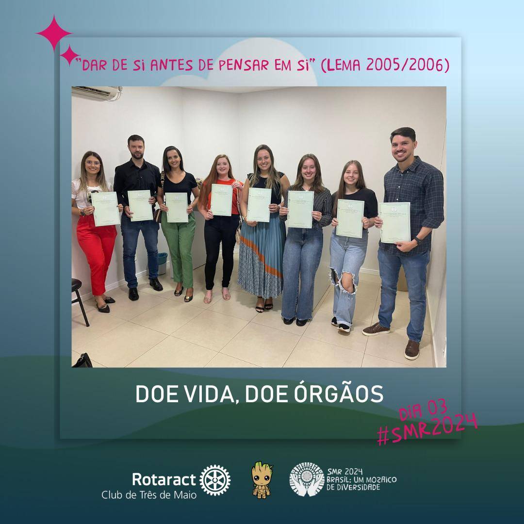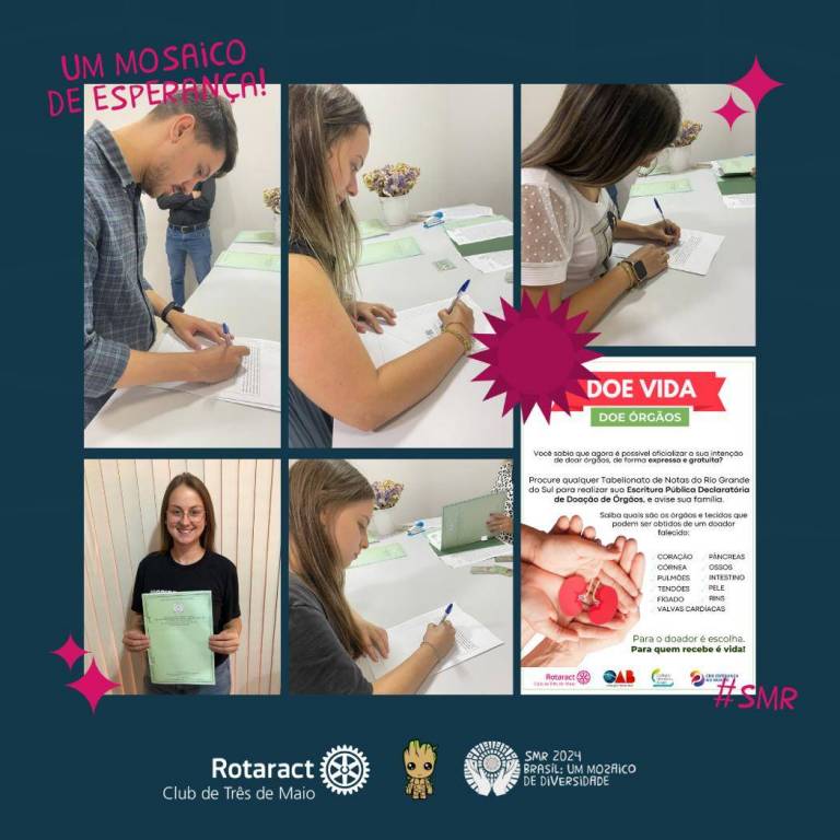 No 3º dia da Semana Mundial do Rotaract, trazemos a ação realizada no dia 20 de fevereiro, onde os companheiros do Rotaract Club e membros da Subseção da OAB de Três de Maio realizaram a Escritura Pública de Doação de Órgãos junto ao Tabelionato de Notas. Um ato que incentiva a documentação da vontade de ser doador.