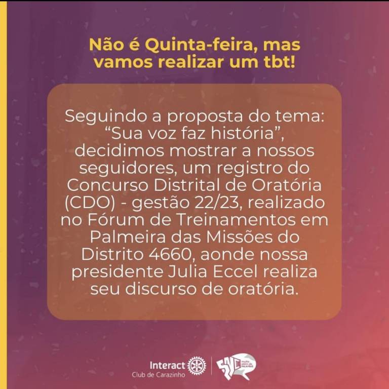🗣️ Neste primeiro dia, com o tema: “Sua voz faz história”, vamos relembrar do dia em que a nossa presidente @julia.eccel participou do Concurso Distrital de Oratória (CDO) da gestão 22/23, no Fórum de Treinamentos em Palmeira das Missões.