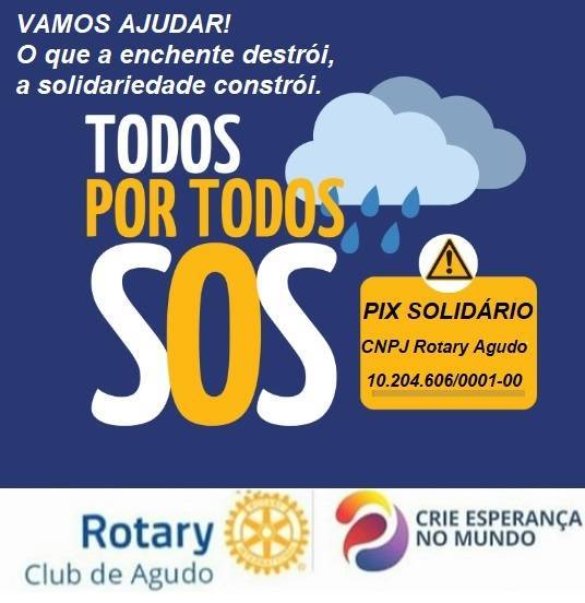 O Rotary Club de Agudo, sensibilizado pelo momento trágico no Torrão Amigo, está promovendo a CAMPANHA PIX SOLIDÁRIO, cujos valores serão destinados à Cozinha Solidária (preparação de refeições para as vítimas), aquisição de alimentos, água, produtos de limpeza/higiene, dentre outros, em auxílio aos atingidos pelas enchentes no município de Agudo. Contamos com o auxílio de todos. Precisamos de você