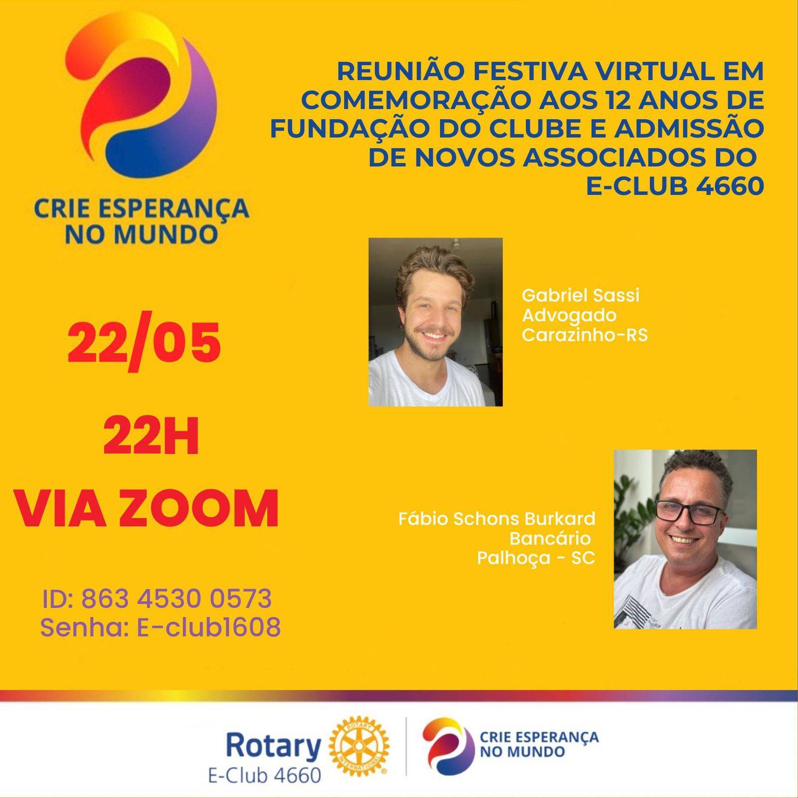Tópico: REUNIÃO FESTIVA EM COMEMORAÇÃO AOS 12 ANOS DE FUNDAÇÃO DO CLUBE E ADMISSÃO DE NOVOS ASSOCIADOS DO ROTARY E-CLUB 4660