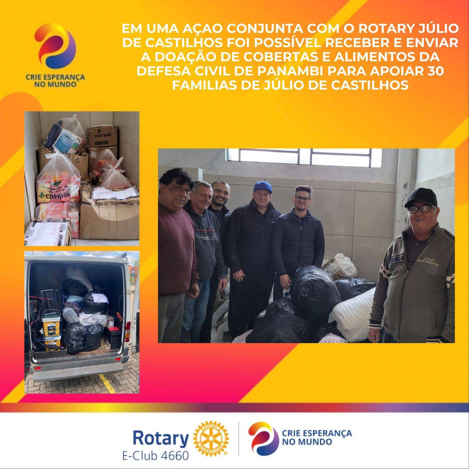 A Defesa Civil de Panambi foi acionada pelo clube de Júlio de Castilhos e prontamente doou alimentos e cobertores. O Rotary E-Club 4660 conseguiu com a empresa Caleffi Eventos logística da doação. Essa ação conjunta vai beneficiar 30 famílias que são atendidas pela assistência social do município. #Rotary #PessoasemAção