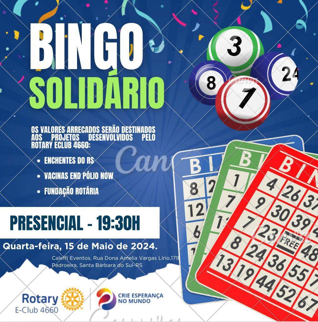 Quarta feira 15 de Maio, presencialmente a companheira Dulce fará um bingo solidário e o valor arrecadado será destinado para os projetos do Rotary E-Club 4660. ✅ Participe!