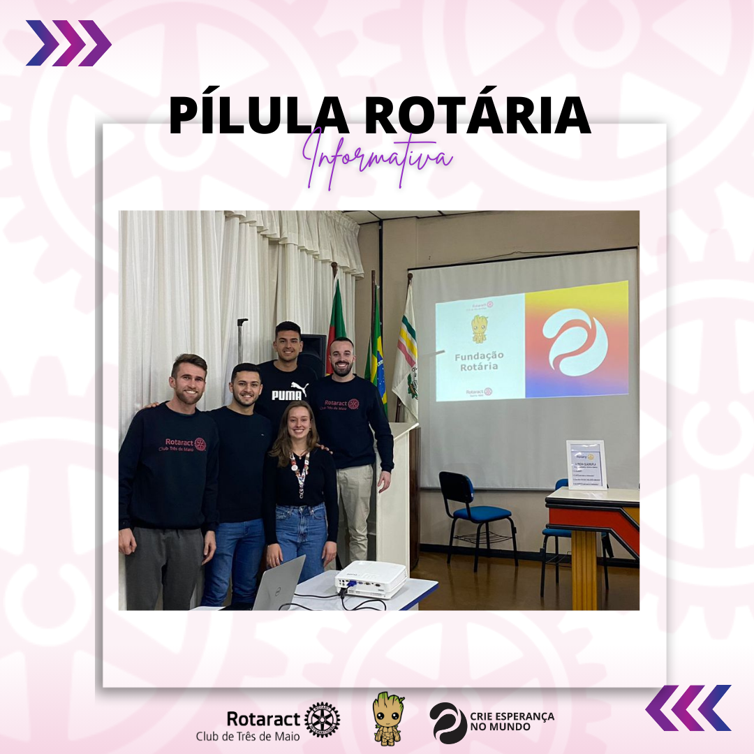 A partir dessa ampla gama de atuação da Fundação Rotária e a falta de conhecimento por boa parte dos companheiros e convidados do Rotaract Club de Três de Maio, o projeto “Pílula Rotária Informativa” foi desenvolvido, com o intuito de promover um conhecimento sobre os programas de atuação e como os mesmos podem ser usufruídos em prol ao desenvolvimento comunitário, por meio de leituras mensais de informações e/ou curiosidades aos companheiros do clube.