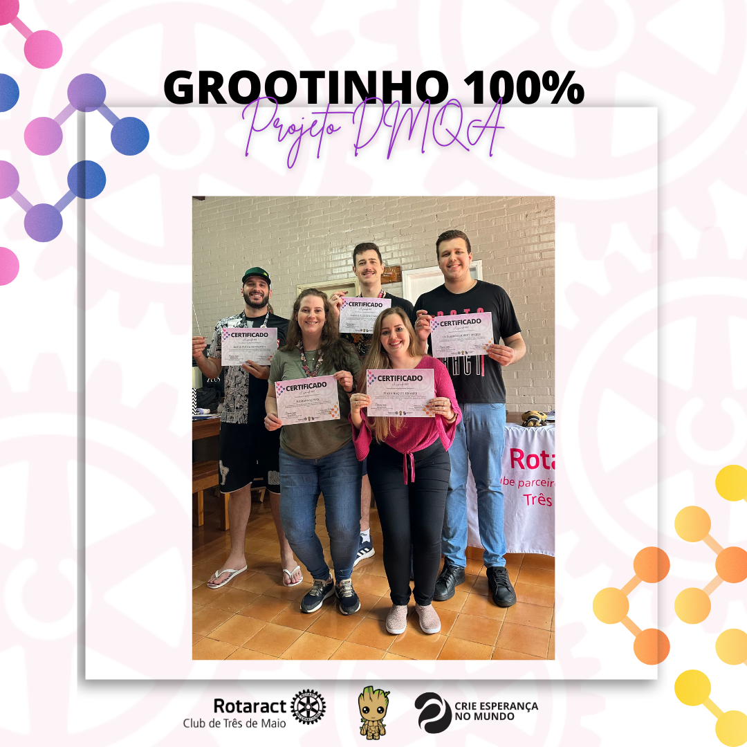 Para incentivar a participação dos associados nas atividades do clube durante o Ano Rotário 2023/2024, desenvolveu-se o projeto "Grootinho 100%", uma vez que o super-herói nominado “Groot” é o mascote do Rotaract Club de Três de Maio. Nos moldes de gestões anteriores, buscou-se presentear e homenagear os associados que possuíam de 93 a 100% de frequência em reuniões e não possuíam débitos com a tesouraria. Sendo assim, dos 36 associados ativos, 04 se mantiveram em dia com a tesouraria e secretaria e conquistaram seu prêmio de reconhecimento.