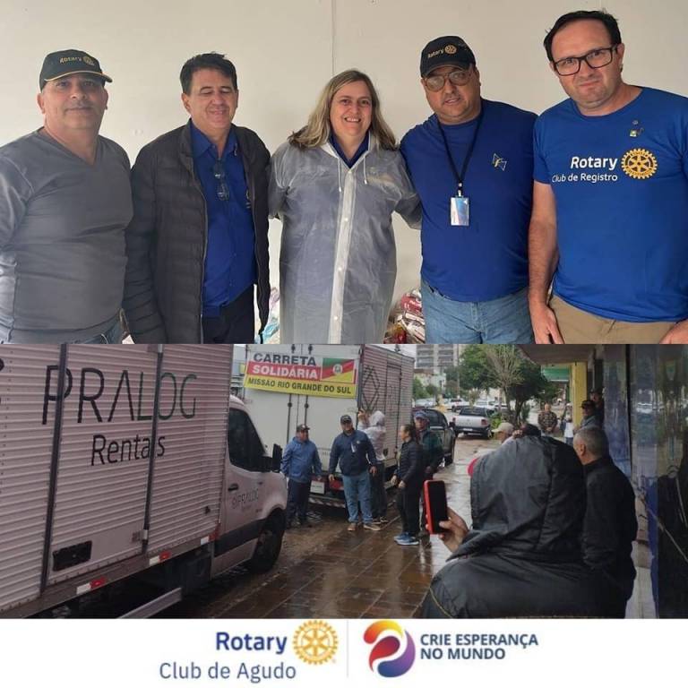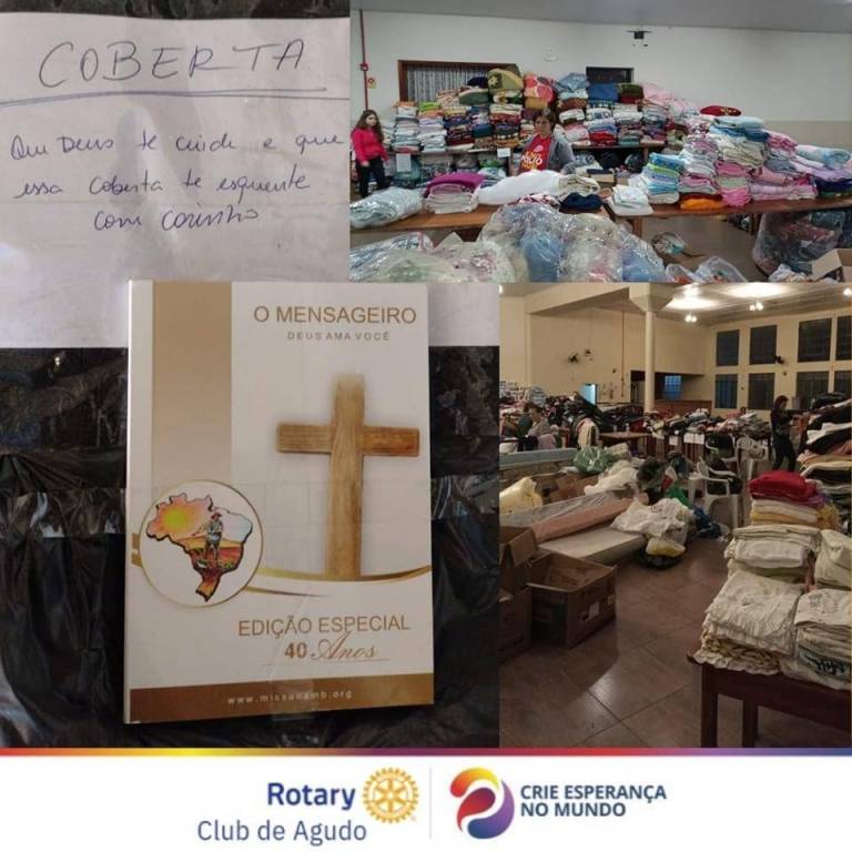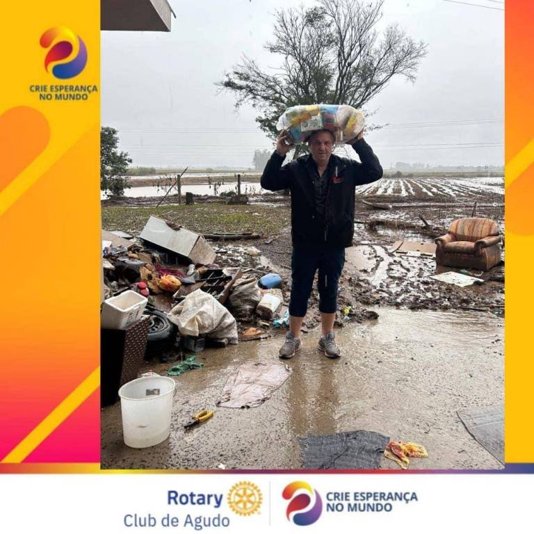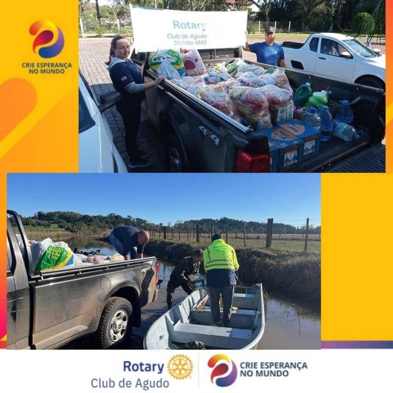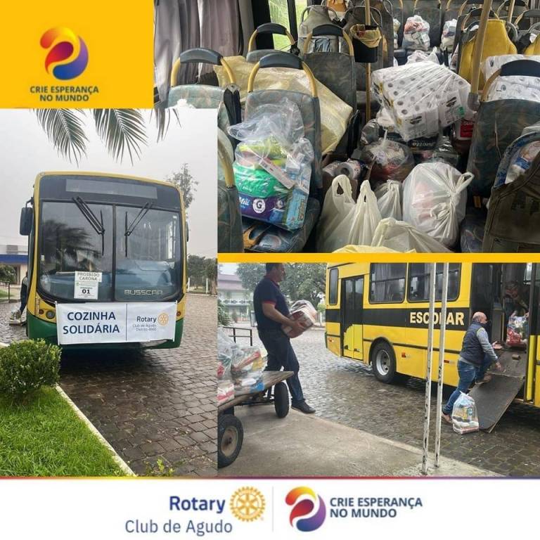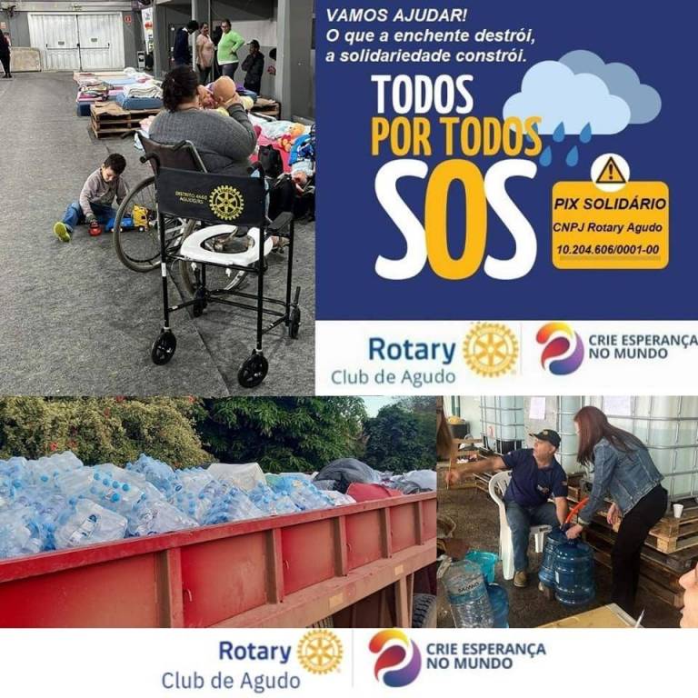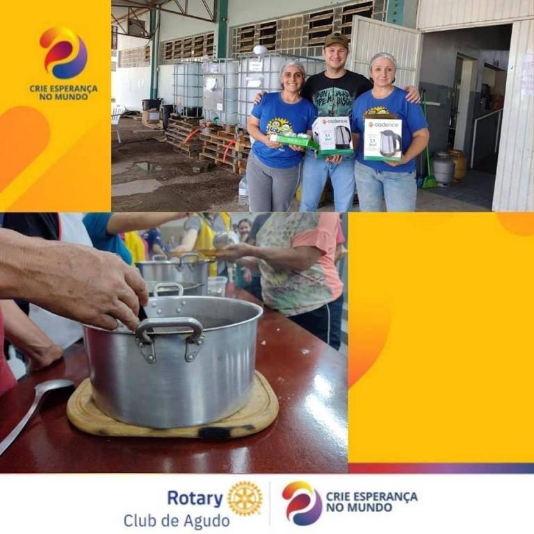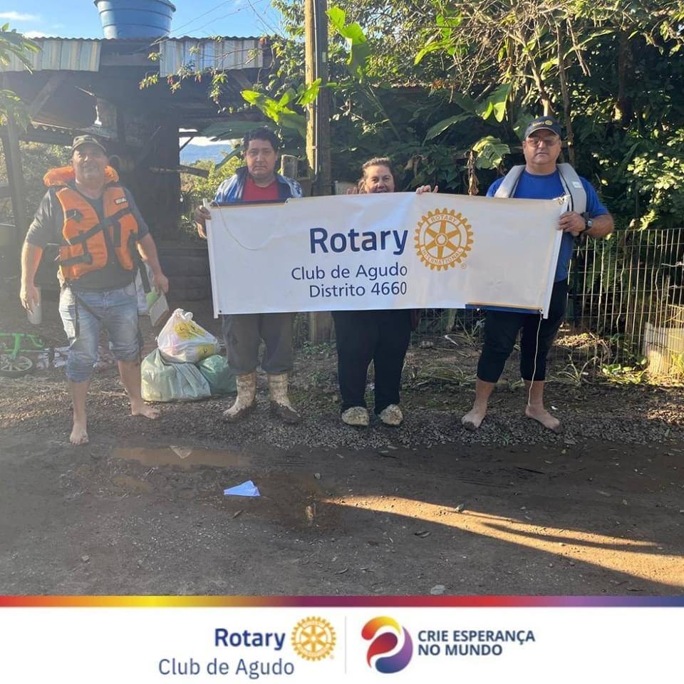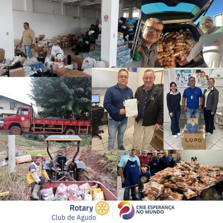 Desde o início da catástrofe climática que assolou o Município de Agudo, colocando nosso Torrão Amigo em calamidade pública, o Rotary Club de Agudo vem promovendo diversas ações que impactam diretamente na vida das vítimas das enchentes, como: a realização da Cozinha Solidária no plano emergencial, preparando refeições para os desabrigados; entrega dos donativos (alimentos, água, produtos de higiene, roupas, calçados, produtos infantis etc) nas diversas localidades do interior de Agudo; e, o mais importante, transmitindo conforto, carinho e esperança àqueles que terão que reconstruir suas vidas.