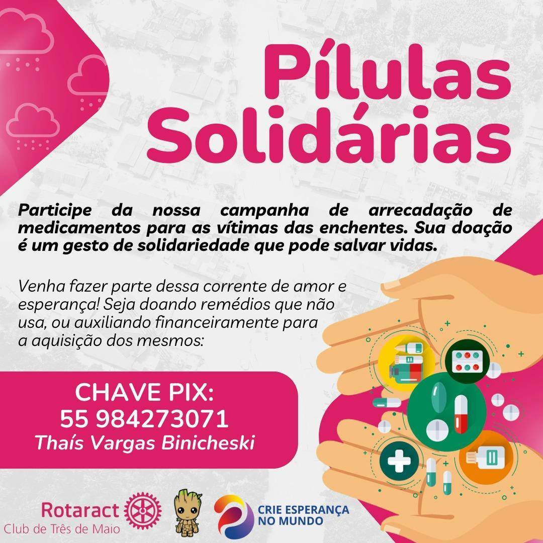 As doações de medicações é um ato de solidariedade que fortalece a resiliência comunitária. A ação “Pílulas Solidárias” foi realizada a partir da declaração de calamidade pública do estado do Rio Grande do Sul, devido às enchentes ocorridas. Com a iniciativa de auxiliar as famílias atingidas, surgiu a ideia da doação de medicações para as pessoas afetadas. Com base nisso, o Rotaract Club de Três de Maio, iniciou uma campanha com o intuito de ajudar as vítimas das enchentes através da doação de medicamentos, desde antibióticos, anti-inflamatórios, pomadas, medicamentos de uso continuo, gazes e soros. O valor arrecadado foi de R$ 4.650,00, todo esse montante destinado exclusivamente a compra de medicamentos.