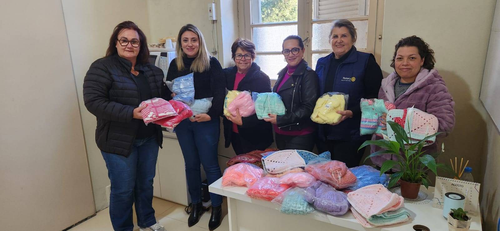 Na tarde de terça-feira, 13 de agosto, representantes do Rotary Club Tupanciretã e voluntárias do Projeto Tecer e Aquecer realizaram a entrega de roupas de bebê no Hospital de Caridade Brasilina Terra,no bairro Severo da Rosa e no bairro Marcial Terra, confeccionadas para famílias que mais necessitam.