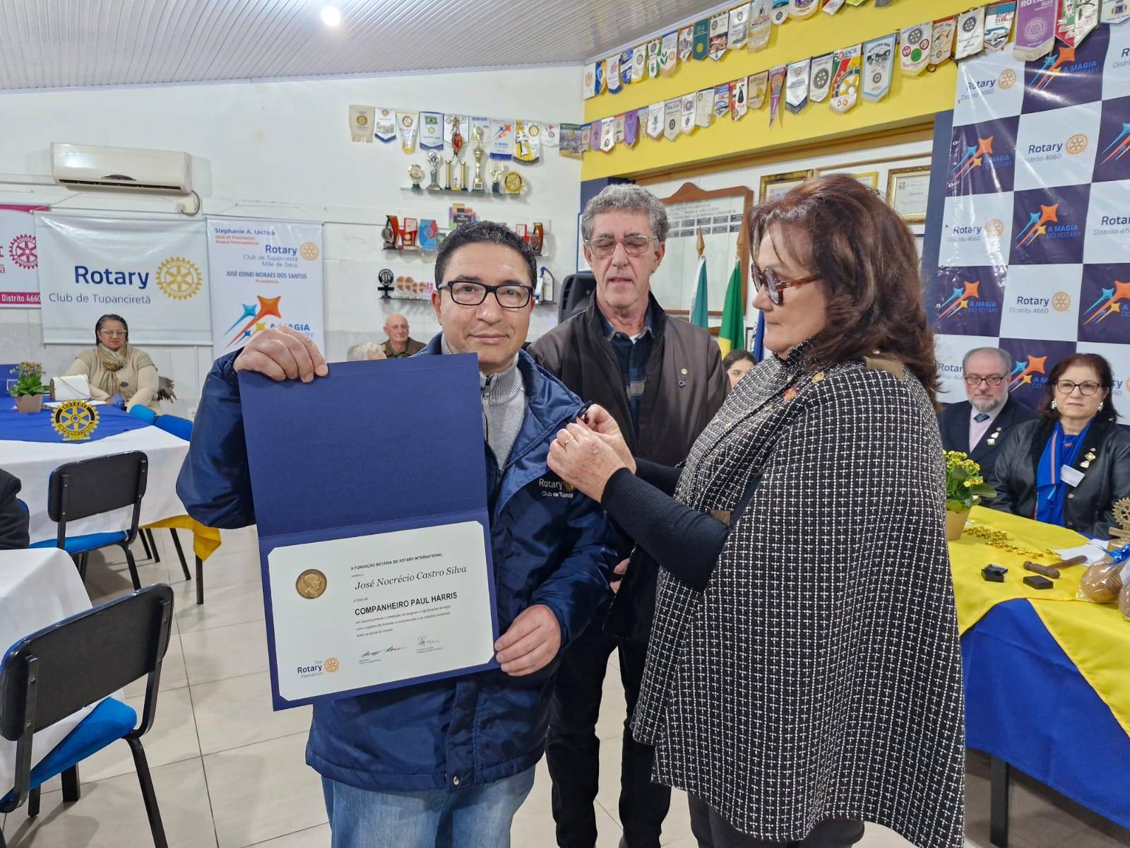 O companheiro José Nocrécio Castro Silva, na noite de 06 de julho de 2024, ocasião da posse da diretoria ano rotário 2024/2025 recebeu o título COMPANHEIRO PAUL HARRIS.