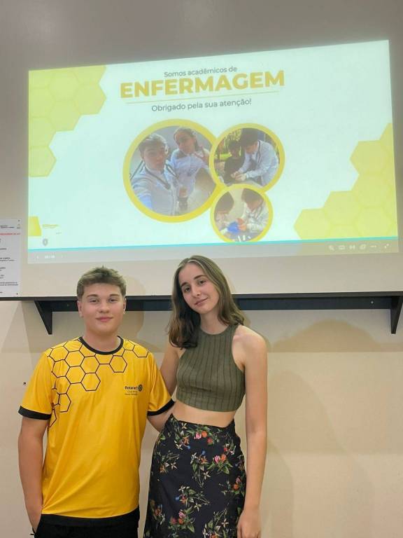 Os primeiros a apresentar foram o presidente e a vice-presidente, falando sobre seu curso acadêmico em enfermagem. Onde Leonardo (@leonardouebel) falou sobre Sinais Vitais, e Giuliana (@_giuliana.dl), sobre Diabetes Mellitus (DM).