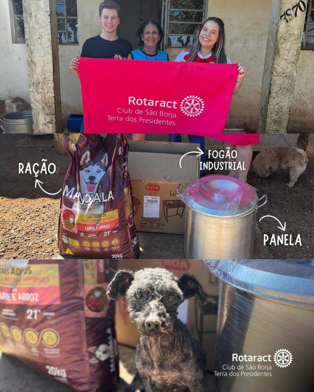 Foi realizado no dia 19/10 o projeto Um Lar de Esperança, destinado a ACOPASB (Associação dos Colaboradores de Proteção Animal de São Borja) um fogão industrial, uma panela grande, 20 kg de ração e 10 kg de arroz, realizado pelo Rotaract Club de São Borja Terra dos Presidentes. Itens essenciais para facilitar a preparação das refeições dos mais de 340 animais que a ACOPASB cuida, garantindo mais conforto para nossos amigos de quatro patas. A ACOPASB, que desempenha um papel vital no acolhimento de animais em situação de abandono em São Borja, enfrenta desafios diários devido à escassez de recursos. Reconhecendo a importância desse trabalho, o Rotaract Club se mobilizou para atender a necessidades básicas do canil, promovendo melhores condições para o cuidado e alimentação dos animais. Com a realização deste o projeto, permitirá uma preparação mais eficiente das refeições, essencial para atender à grande demanda diária. Este gesto não apenas auxilia a ACOPASB, mas também promove conscientização sobre a importância do cuidado com os animais e da colaboração comunitária.