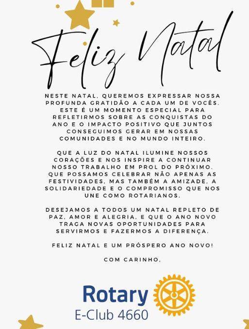 Que a luz do Natal ilumine nossos corações e nos inspire a continuar nosso trabalho em prol do próximo. Que possamos celebrar não apenas as festividades, mas também a amizade, a solidariedade e o compromisso que nos une como rotarianos.