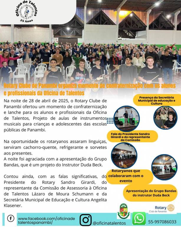 O ano de 2025 é especial para o Rotary Club de Panambi!! Neste ano comemoramos 25 anos do Projeto Oficina de Talentos. Para marcar essa data, no dia 28 de abril, o Rotary Club de Panambi ofereceu aos atuais alunos, familiares, instrutores de música e coordenação do projeto um saboroso lanche. Foi preparado e servido pelos rotarianos cachorro-quente, refrigerante e sorvete para sobremesa. O evento contou com a participação da Secretária Municipal da Educação, Senhora Angelita Klesener, a coordenadora do projeto, Senhora Dorilda de Paula, instrutores de música, alunos e familiares.