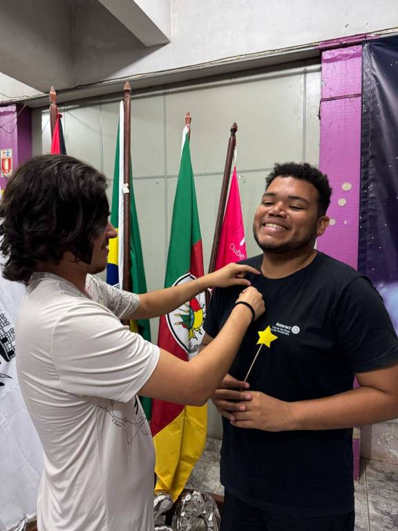 Houve também a realização de pinagem de novo associado. O 1º secretário: João Gabriel Malheiros pinou Edson Alves. O ritual da pinagem simboliza a oficialização da entrada de um novo membro no clube, representando o compromisso com os ideais rotários e o início de uma jornada de serviço.