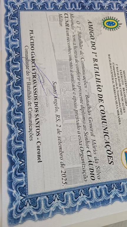 Parabenizamos os companheiros Claudio Cunha e Luiz Aguir, que foram agraciados pelo comandante Coronel Plácido Garcia Travassos dos Santos com o diploma “Amigo do 1º Batalhão de Comunicações”. 🏅