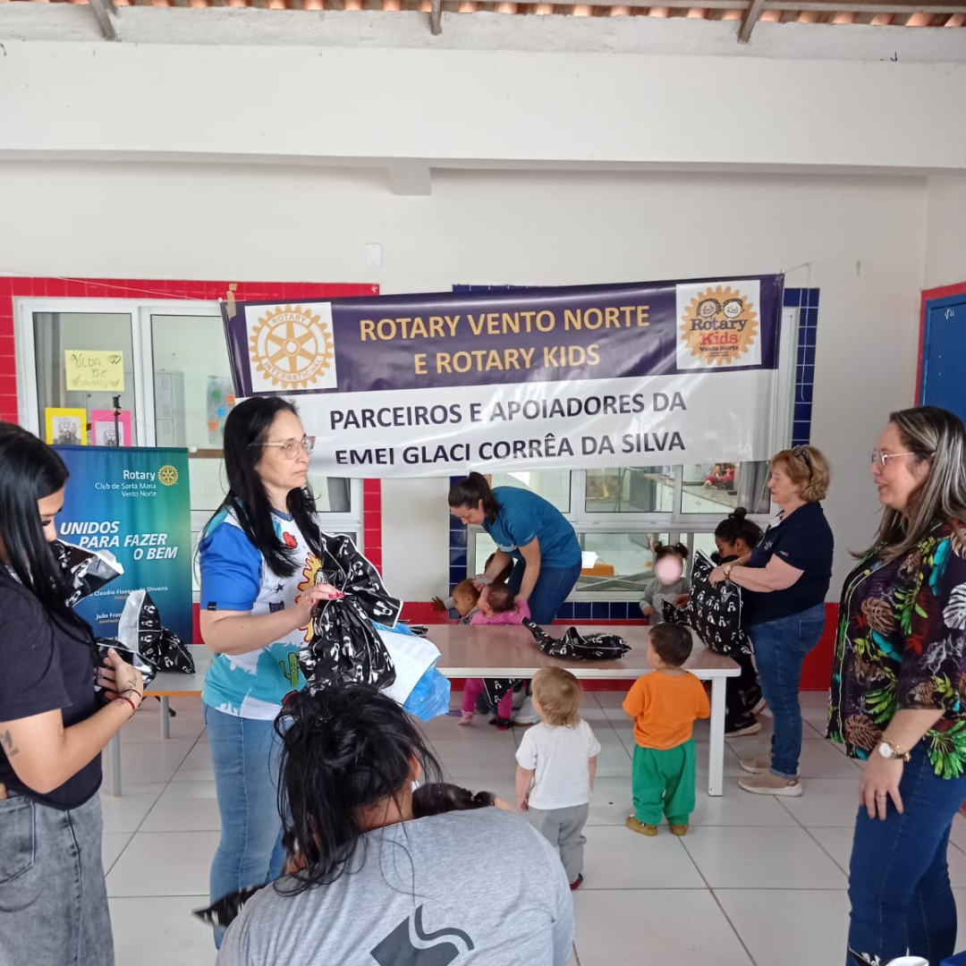 Santa Maria - RS, No dia 13 de outubro de 2025, em clima de alegria e celebração, o RCSM-Vento Norte em ação especial ao Dia das Crianças, esteve na EMEI Prof. Glaci Correa da Silva, para realizar a entrega de brinquedos aos alunos(as) daquele estabelecimento de Ensino. As entregas aconteceram em intervalos de aulas, ente as Turmas de diferente idades, em um total de 118 crianças. Além dos presentes o Clube colaborou com um lanche coletivo aos integrantes da EMEI. O momento foi marcado por sorrisos, empolgação e muita gratidão das crianças, que receberam os mimos com entusiasmo.