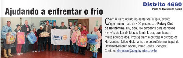 O Rotary Club Horizontina teve um projeto social publicado na Revista Rotary Brasil de agosto. A matéria destaca a doação de 34 edredons feita ao Lar de Idosos Santa Luzia em Horizontina. A doação foi feita com os lucros obtidos no evento do Jantar da Tilápia.