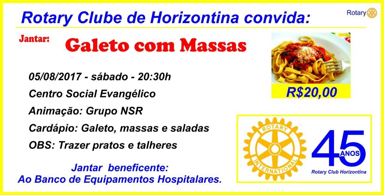 O Rotary Club Horizontina está completando 45 anos e convida para o tradicional Jantar Galeto com Massas. Será neste próximo Sábado, dia 05/08/2017, a partir das 20h30min, nas dependências do Centro Social Evangélico, com animação do Grupo NSR.