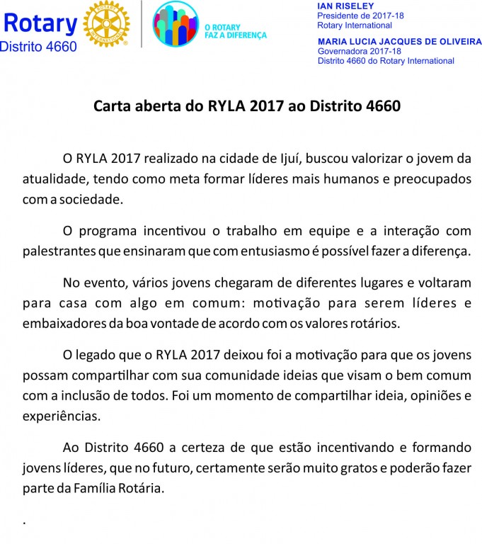 Carta aberta do RYLA 2017 ao Distrito 4660