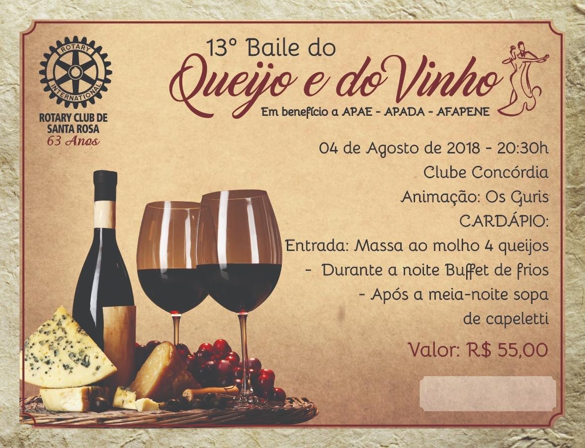 Com o ideal de servir e o lema “dar de si antes de pensar em si”, o Rotary Santa Rosa realizou no dia 04 de agosto de 2018 o 13º Baile do Queijo e do Vinho, sob a presidência do rotariano David Danda.