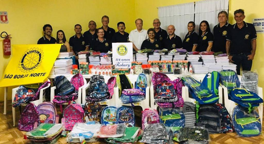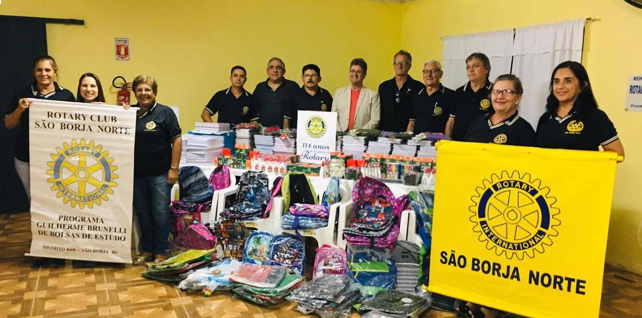 O Rotary Club São Borja Norte realizou na noite de 28 de Fevereiro de 2019, a entrega de kits de material escolar aos gestares estadual e municipal, que serão repassados a alunos em vulnerabilidade social das escolas das redes estadual e municipal de ensino. Os kits são adquiridos através de Projeto desenvolvido pelo Rotary Club há alguns anos, com recursos oriundos de chamada pública do Ministério Público.