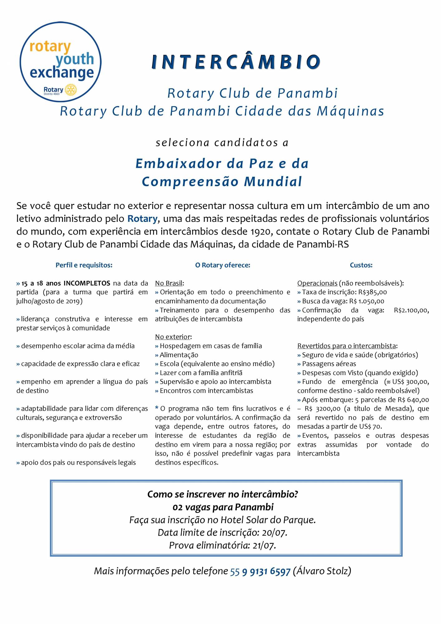 Se você quer estudar no exterior e representar nossa cultura em um intercâmbio de um ano letivo administrado pelo Rotary, uma das mais respeitadas redes de profissionais voluntários do mundo, com experiência em intercâmbios desde 1920, contate o Rotary Club de Panambi e o Rotary Club de Panambi Cidade das Máquinas, da cidade de Panambi-RS.