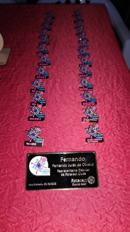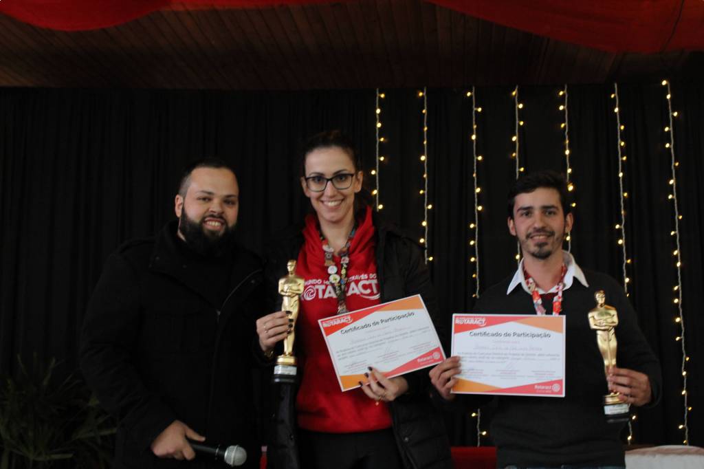 Foram entregues também certificados e pins de reconhecimento de 3 anos de serviços voluntários prestados ao Rotaract para os companheiros Joctã Gonçalves, Fabiana Barz, Letícia Bohrer e Ana Pause.
