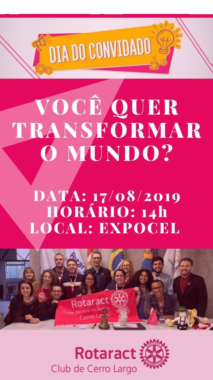 O Rotaract Club de Cerro Largo promove mais um DIA DO CONVIDADO. A atividade acontecerá no próximo sábado, 17 de agosto, a partir das 14h, e será aberta à comunidade. A intenção é apresentar o clube para jovens que têm demonstrado interesse nas ações do grupo e incentivar estes a integrarem o clube ou a participarem de ações e projetos como voluntários.