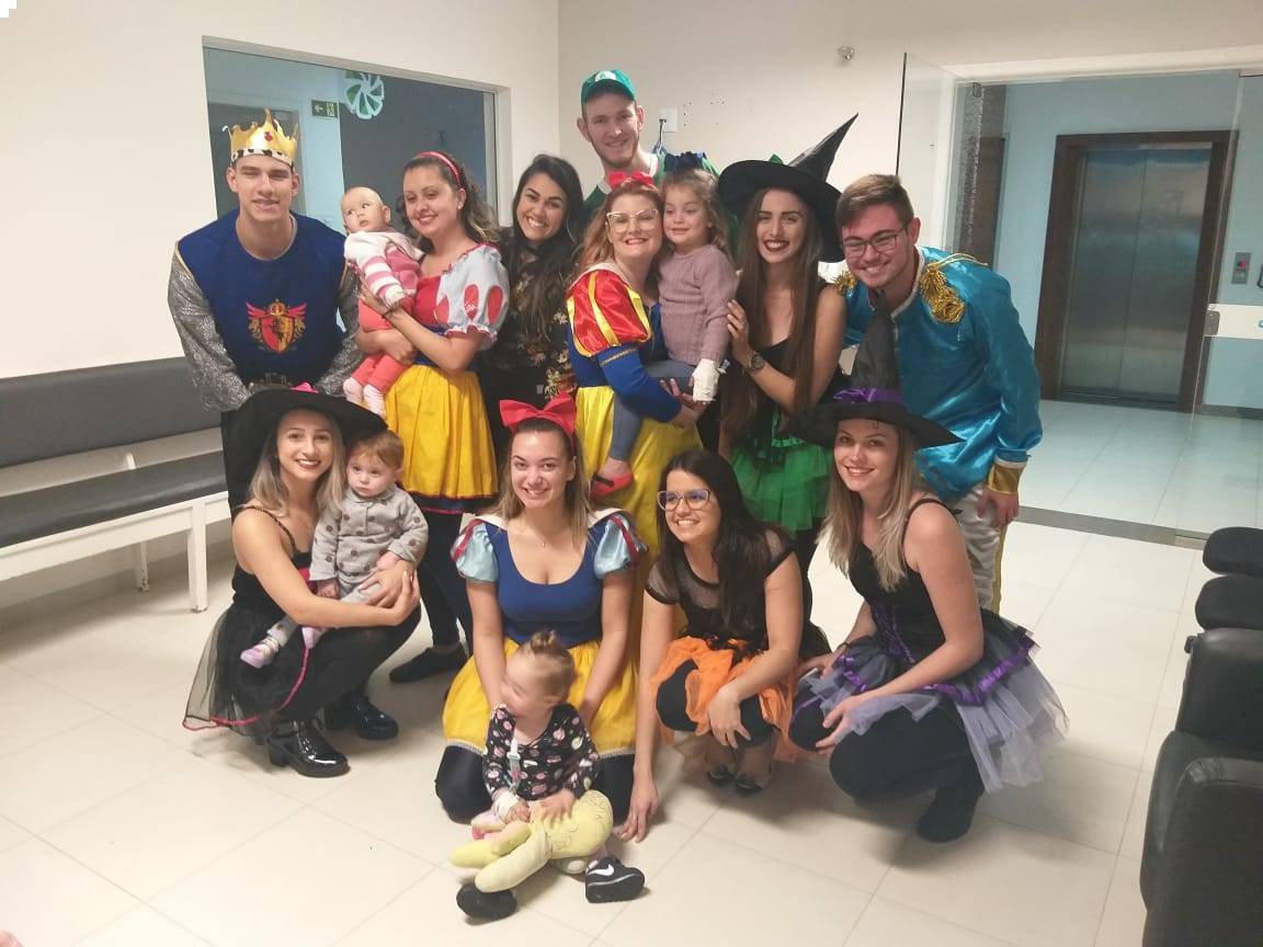 Em nossa primeira visita realizamos uma visita especial para as crianças em seus quartos. Na sequência contamos a história "A Branca de Neve" através de um teatro.