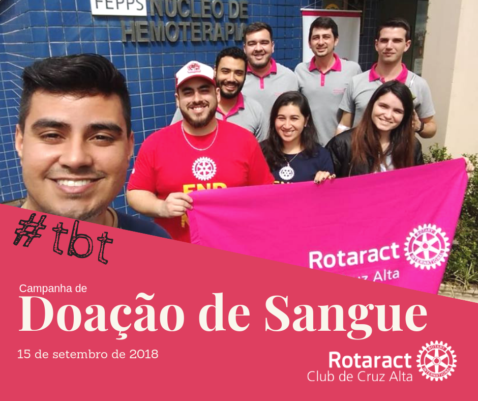 Na imagem acima, está a foto de 8 membros do Rotaract Club de Cruz Alta, em frente ao Hemocentro de Cruz Alta. Abaixo à imagem, está escrito "#tbt Campanha de Doação de Sangue - 15 de setembro de 2018", e a logomarca do Club em branco.
