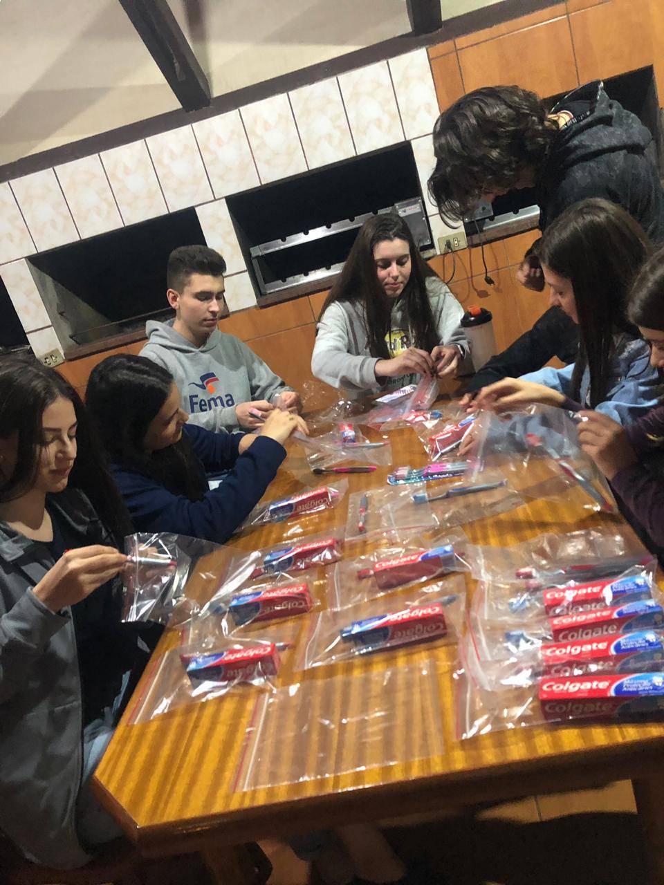 Alguns companheiros se reuníram na noite de ontem, 17/9/29, para efetuar a monatem dos kits de higiene dental que serão destinados ao Espaço Feliz.