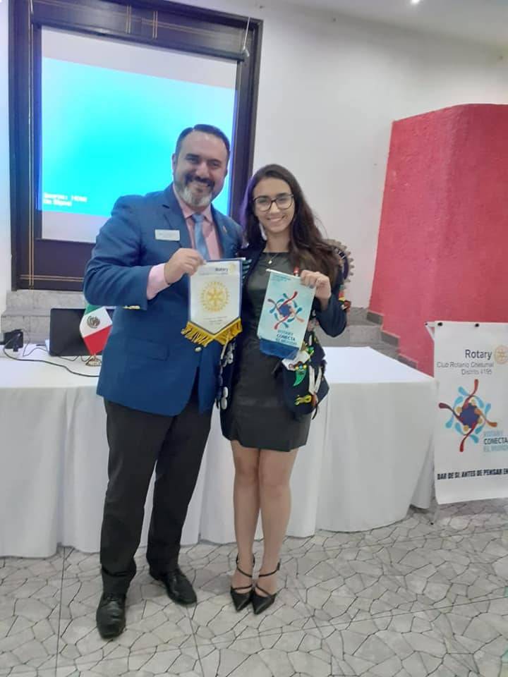 Intercambista Luísa Golin entregando a Flâmula do nosso clube ao governador do Distrito 4195.